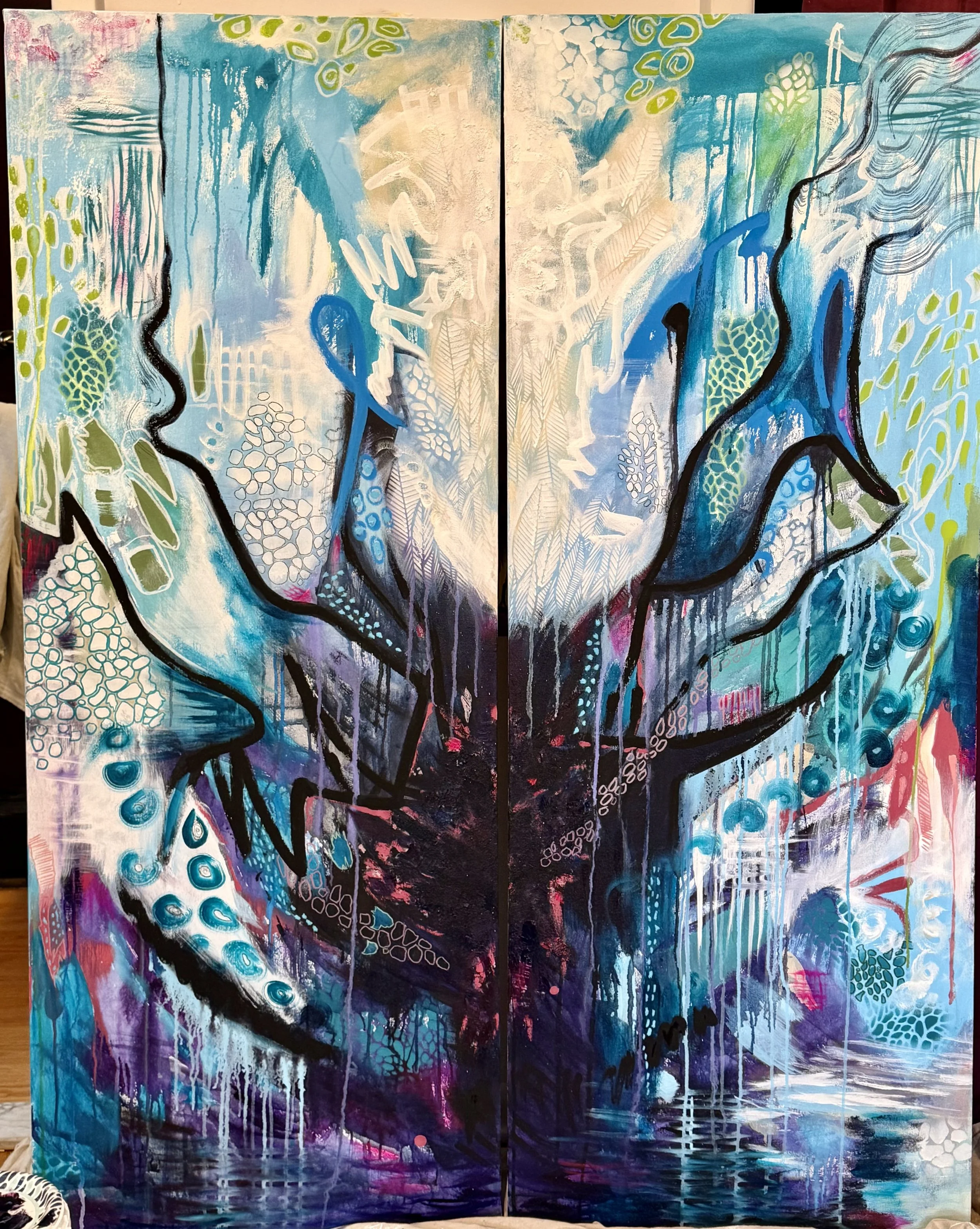 I was on my hands and knees with these two giant panels, and I used my hands, my arms, my whole body to move the fluid paint across the canvas. It was a physical, primal, and intuitive act. It felt necessary. To create a work about the body, I had to put my own body into the work from the very first mark. At times it got aggressive, and others felt calm.